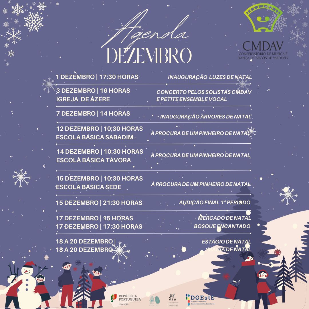 Programação Cultural de Dezembro Eventos A programação cultural do mês de dezembro do Conservatorio de Música e Dança de Arcos de Valdevez antevê um conjunto diverso de eventos culturais no âmbito da música, do teatro e da dança. 🎼. Dezembro #CMDAV#atuaescoladeartes#escolafeliz